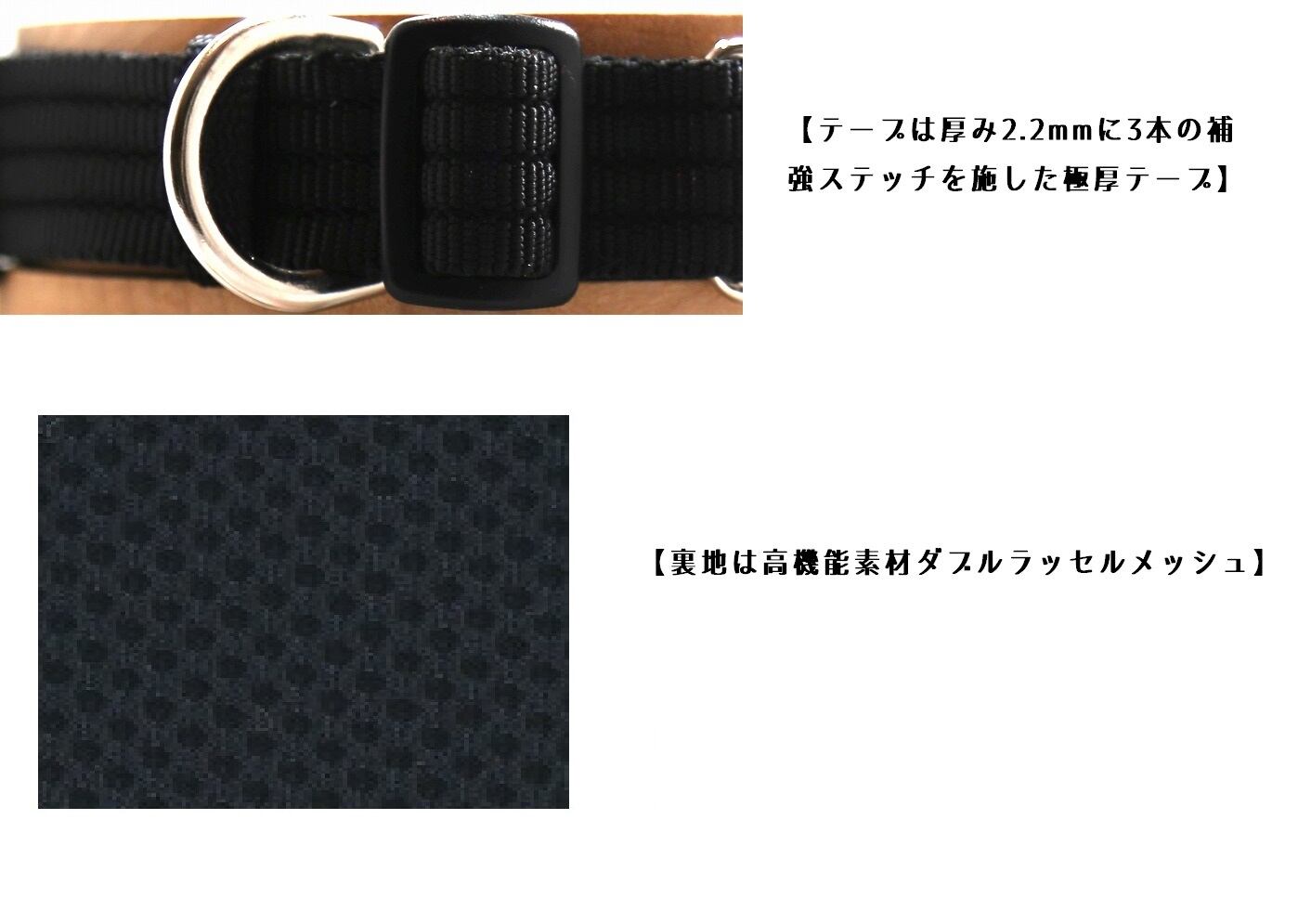 大型犬用に、通常のテープ(1.6mm厚)よりも更に耐久性の強い2.2mm厚に3本の補強ステッチを施した極厚テープを使用しています。